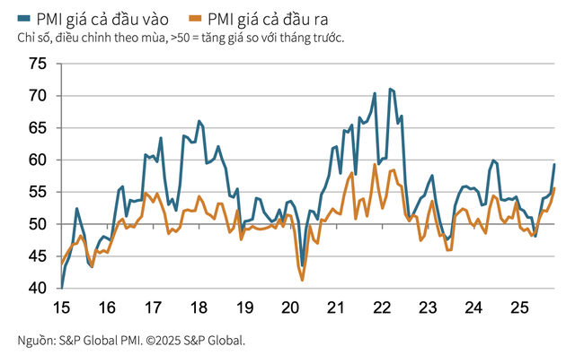Chi phí đầu vào trong tháng 10 cũng tăng nhanh hơn và đạt mức cao nhất kể từ tháng 7/2024, khi 27% doanh nghiệp tham gia khảo sát ghi nhận giá nguyên vật liệu tăng do nguồn cung khan hiếm. Trước áp lực chi phí, giá bán đầu ra cũng được điều chỉnh tăng, lên mức cao nhất trong vòng 40 tháng.
