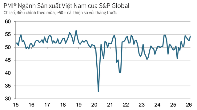 Chỉ số Nhà Quản trị Mua hàng (PMI®) ngành sản xuất Việt Nam của S&P Global tăng lên 54,3 điểm trong tháng 2, so với 52,5 điểm của tháng 1 và đạt mức cao nhất trong bốn tháng. Chỉ số PMI cho thấy sức khỏe của ngành cải thiện đáng kể so với tháng trước, qua đó kéo dài chuỗi cải thiện điều kiện kinh doanh hiện tại lên tám tháng liên tiếp.