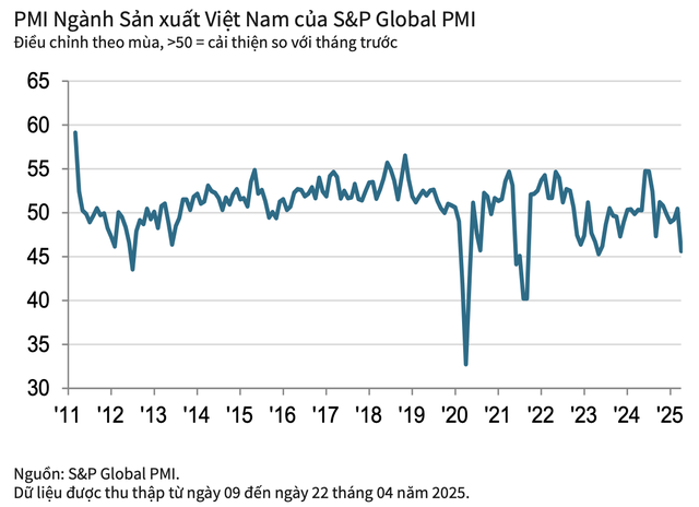 Ông Andrew Harker, Giám đốc Kinh tế tại S&P Global Market Intelligence đánh giá, việc áp thuế của Mỹ đã đẩy ngành sản xuất Việt Nam vào tình trạng suy giảm trong tháng 4, khi các công ty đang chứng kiến sự sụt giảm đáng kể của số lượng đơn đặt hàng mới, xuất khẩu và sản lượng. Hơn nữa, khả năng tiếp tục xảy ra gián đoạn cho ngành sản xuất do thuế quan bổ sung khiến niềm tin kinh doanh giảm và trở thành một trong những mức thấp nhất từng được ghi nhận.