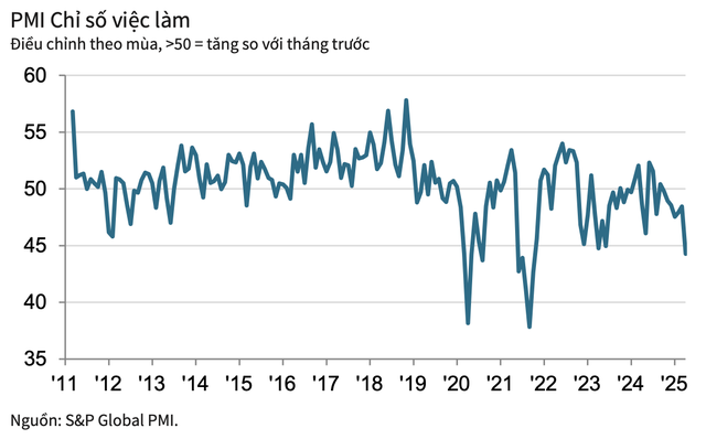 Số lượng đơn đặt hàng xuất khẩu mới thậm chí còn giảm nhanh hơn tổng số lượng đơn đặt hàng mới trước những tuyên bố về thuế quan. Lần giảm thứ sáu liên tiếp của số lượng đơn đặt hàng mới từ nước ngoài là đáng kể nhất kể từ tháng 6/2023.