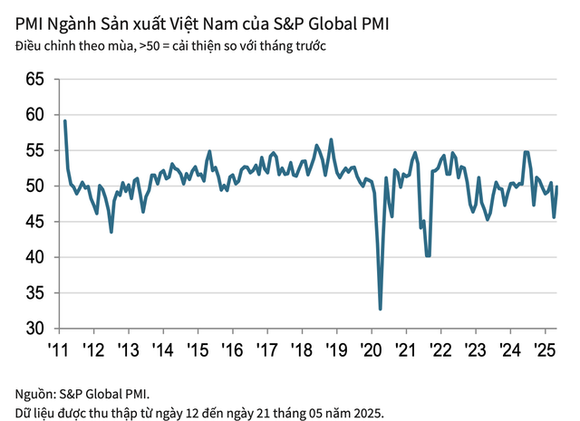 Theo S&P Global, số lượng đơn đặt hàng mới trong ngành sản xuất của Việt Nam tiếp tục giảm vào tháng 5 khi thuế quan của Mỹ được cho là đã ảnh hưởng đến nhu cầu xuất khẩu. Tuy nhiên, sản lượng đã tăng trưởng trở lại và các điều kiện kinh doanh tổng thể hầu như không thay đổi khi một số công ty ghi nhận chính sách thuế quan ổn định hơn so với tháng 4.