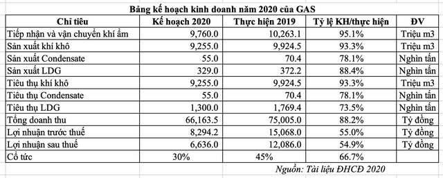 Trong đại hội cổ đông, GAS đã tổng kết tình hình kinh doanh năm 2019 với tổng khí ẩm là 10.263,1 triệu m3, tổng doanh thu 75.005 tỷ đồng, lợi nhuận 12.085,7 tỷ đồng, lần lượt hoàn thành 105%, 117% và 158% kế hoạch đặt ra tại đại hội cổ đông năm 2019. Trong năm 2019, Công ty đặt kế hoạch kinh doanh dựa trên giá dầu 65 USD/thùng, thực tế là 64,2 USD/thùng, giảm 11% so với năm 2018