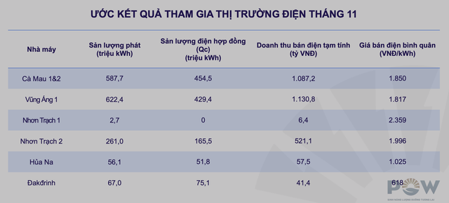 Trong tháng 11, tổng sản lượng điện của các nhà máy điện của PV Power ước đạt khoảng 1.597 triệu kWh và doanh thu của toàn PV Power đạt khoảng 2.916 tỷ đồng.