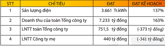 Theo đó, công ty đã quản lý kỹ thuật, vận hành sản xuất, sửa chữa bảo dưỡng các nhà máy điện ổn định, an toàn, đáp ứng yêu cầu huy động của A0. Sản lượng điện sản xuất quý I đạt 3.661 triệu kWh, vượt 37% kế hoạch. Giá thị trường điện toàn phần tháng 3/2022 trung bình đạt 1.761,33 đồng/kWh, cao hơn trung bình cùng kỳ năm 2021 (1.289,77 đồng/kWh). Hai yếu tố trên giúp doanh thu toàn Tổng công ty đạt 7.233 tỷ đồng, bằng 163% kế hoạch quý và bằng 93% so với cùng kỳ năm 2021. Lợi nhuận trước thuế toàn Tổng công ty đạt 751,5 tỷ đồng. Tại quý I/2021, lợi nhuận trước thuế hợp nhất chỉ đạt hơn 677 tỷ đồng.