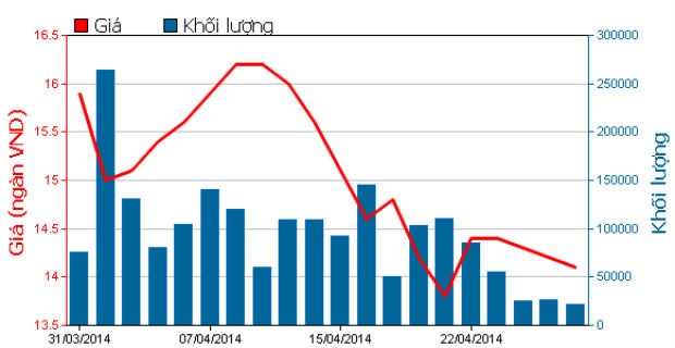 Đóng cửa phiên giao dịch cuối cùng tháng 4, mã này đứng giá tham chiếu 14.100 đồng và chỉ khớp được hơn 60.000 đơn vị.
