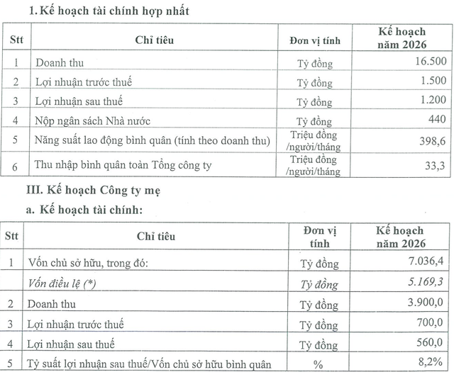 Về Công ty mẹ, Công ty dự kiến mục tiêu doanh thu đạt 3.900 tỷ đồng và lợi nhuận sau thuế là 560 tỷ đồng. Tỷ lệ chia cổ tức dự kiến 10%.