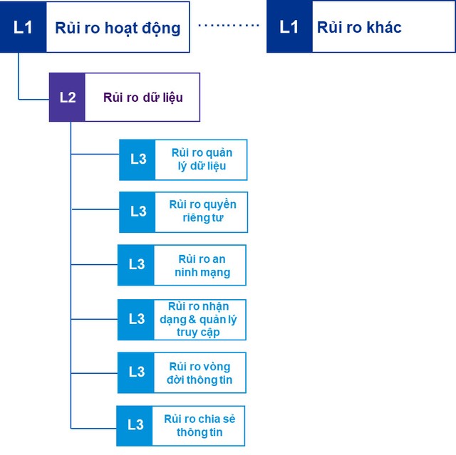 Rủi ro dữ liệu có thể được phân thành 06 nhóm bao gồm (i) Rủi ro Quản lý Dữ liệu, (ii) Rủi ro Quyền riêng tư, (iii) Rủi ro An ninh mạng, (iv) Rủi ro Nhận dạng và Quản lý truy cập, (v) Rủi ro Vòng đời thông tin, (vi) Rủi ro Chia sẻ thông tin.