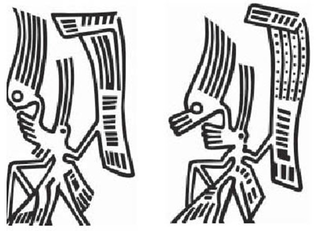 Hình người trên trống Đồng Lạc Việt với mũ có hình đầu rồng (Bên phải) và hai dải mũ cao vút.