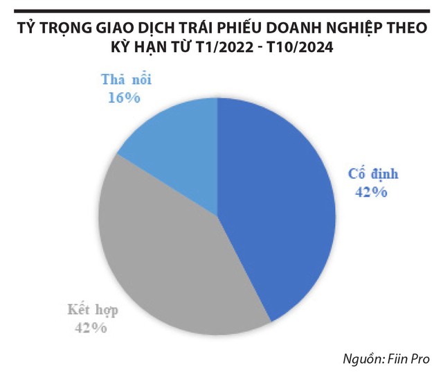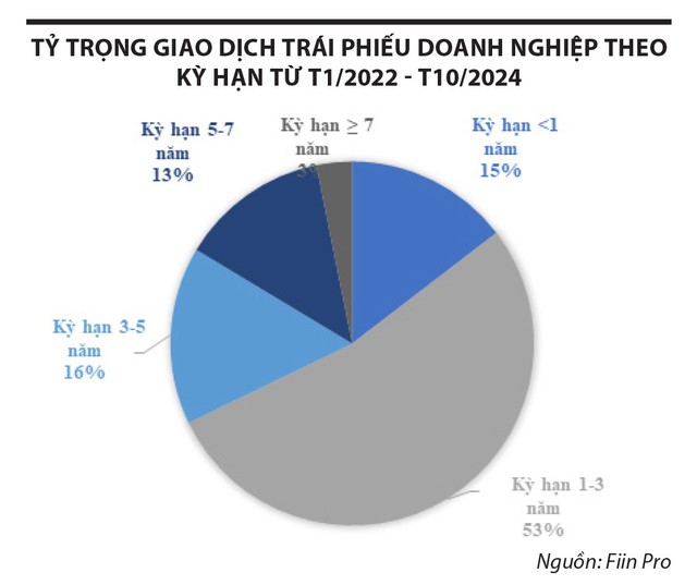 Thứ hai, quản trị rủi ro lãi suất. Nhà đầu tư nên tập trung vào các trái phiếu có kỳ hạn từ 1 - 3 năm, dù có lãi suất cố định hay lãi suất thả nổi, để giảm thiểu rủi ro từ biến động lãi suất. Theo dữ liệu giao dịch từ tháng 1/2022 đến cuối tháng 10/2024, các trái phiếu được giao dịch chủ yếu có kỳ hạn ngắn hơn 4 năm, phản ánh xu hướng thị trường ưa chuộng các sản phẩm này.