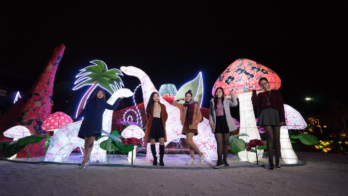 Đèn lồng đủ hình dáng như khủng long, hoa cỏ được đặt quanh ngọn đồi ánh sáng, để du khách có thể check-in ở bất cứ góc nào.