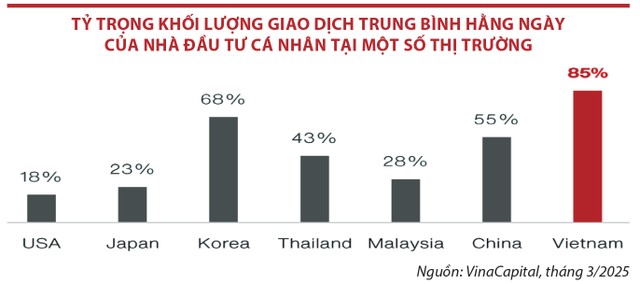Tuy nhiên, số lượng quỹ đầu tư chứng khoán còn hạn chế, nên chỉ có 3,5% hoạt động đầu tư trên thị trường cổ phiếu và 16,7% hoạt động đầu tư trên thị trường trái phiếu được thực hiện qua các quỹ đầu tư chứng khoán, ở mức thấp so với nhiều thị trường trong khu vực. Tỷ lệ tự giao dịch của các nhà đầu tư cá nhân tại Việt Nam duy trì ở mức cao, với 85% vào thời điểm cuối năm 2024, trong khi tỷ lệ này ở thị trường phát triển như Mỹ, Nhật Bản là khoảng 20%, tại các thị trường trong khu vực như Malaysia, Thái Lan trong khoảng 30 - 40%.