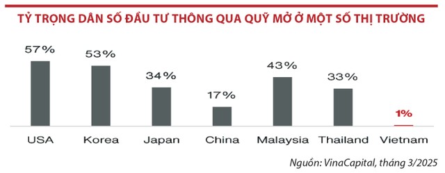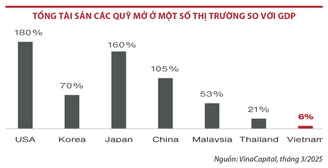 Tuy nhiên, với giá trị tài sản ròng của các quỹ mở chỉ bằng 6% GDP, quy mô tài chính của các quỹ đầu tư chứng khoán có khoảng cách xa so với nhiều thị trường trên thế giới như Nhật Bản, Hàn Quốc, Mỹ (giá trị tài sản của riêng các quỹ ETF tại Mỹ vào thời điểm cuối năm 2024 đạt 10.600 tỷ USD). Trong khu vực ASEAN, Malaysia và Thái Lan ghi nhận tỷ lệ này lần lượt là 53% và 21% vào năm 2024.