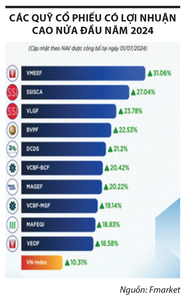 Các quỹ khác có hiệu suất đầu tư tích cực trong nửa đầu năm 2024 bao gồm nhóm quỹ của VinaCapital, VBCF, Dragon Capital…