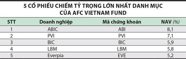 Tính tới cuối tháng 11/2022, AFC Vietnam Fund có NAV 51,5 triệu USD, nắm giữ 48 mã cổ phiếu và 5,1% tỷ trọng tiền mặt. Trong đó, các cổ phiếu chiếm tỷ trọng lớn nhất bao gồm ABI, PVI, BIC, LBM và EVE.