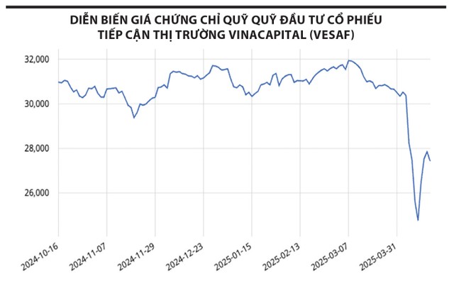 Chẳng hạn, bộ 3 quỹ mở cổ phiếu của VinaCapital, bao gồm VEOF, VESAF, VDEF – thuộc nhóm có hiệu suất đầu tư cao nhất thị trường năm 2024, có quỹ đạt mức tăng trưởng hơn 30%, đã rơi vào tăng trưởng âm trong thời gian qua. Tính tới ngày 16/4/2025, hiệu suất đầu tư của VEOF, VESAF và VDEF lần lượt là -12,94%, -12,96% và -13,55% (theo dữ liệu của Fmarket).