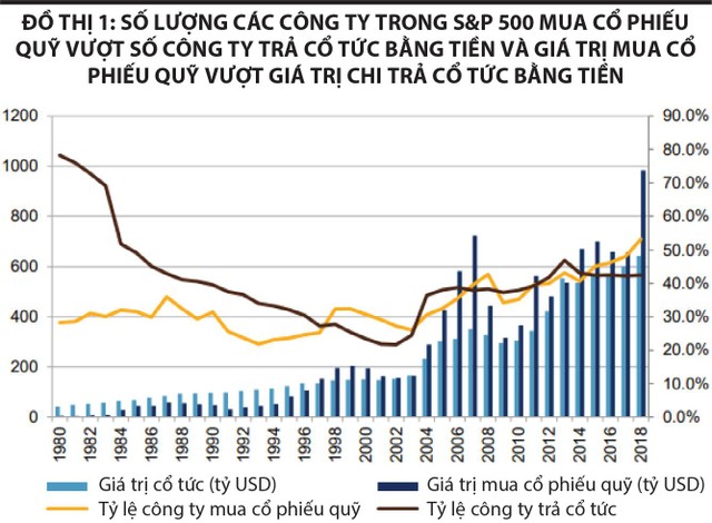 Theo thống kê, số lượng các công ty trong chỉ số S&P 500 thực hiện mua cổ phiếu quỹ vượt số công ty chọn trả cổ tức bằng tiền mặt. Giá trị mua cổ phiếu quỹ cũng vượt giá trị chi trả cổ tức bằng tiền (xem đồ thị 1).
