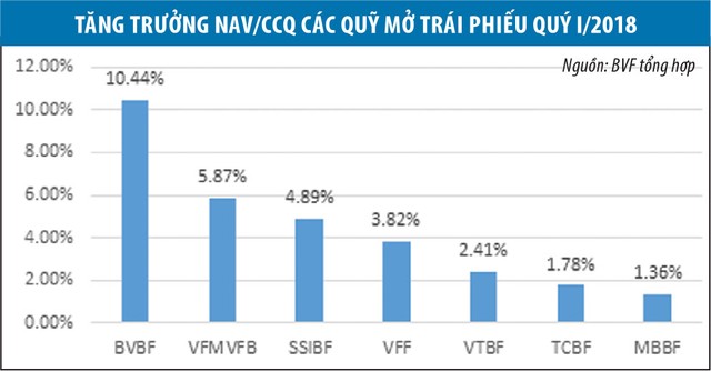 Các quỹ mở do BVF quản lý cũng đạt kết quả tốt so với thị trường. Cụ thể, Quỹ đầu tư trái phiếu Bảo Việt (BVBF) ghi nhận mức tăng trưởng giá trị tài sản ròng/chứng chỉ quỹ (NAV/CCQ) là 10,44% trong quý I, giúp Quỹ vươn lên đứng đầu về mức tăng trưởng trong các quỹ mở trái phiếu tại Việt Nam.