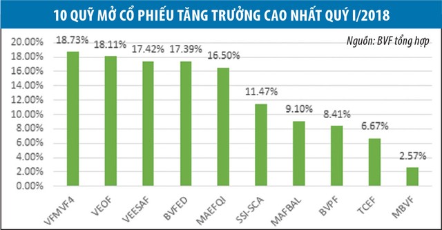 Giá một chứng chỉ quỹ của Quỹ đầu tư cổ phiếu năng động Bảo Việt (BVFED) tại 31/3/2018 là 19.268 đồng, tăng 17,4% so với cuối năm 2017 và nằm trong Top 5 quỹ mở cổ phiếu có mức tăng trưởng cao nhất thị trường. Quỹ đầu tư cổ phiếu triển vọng Bảo Việt (BVPF) cũng ghi nhận mức tăng trưởng khá là 8,4%.