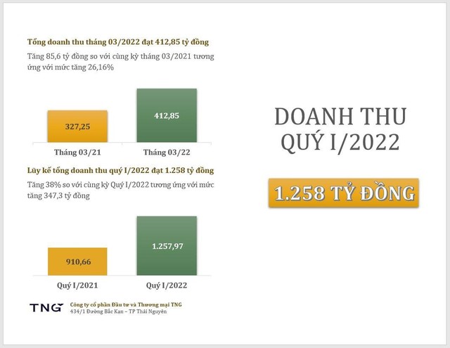 Ngày 24/4 tới đây, TNG sẽ tổ chức ĐHĐCĐ thường niên 2022. Tại đây, Công ty sẽ trình cổ đông thông qua kế hoạch kinh doanh với doanh thu dự kiến đạt 5.990 tỷ đồng và lãi sau thuế đạt 279 tỷ đồng, lần lượt tăng trưởng 10% và 20% so với năm trước. Như vậy, trong quý đầu tiên, Công ty đã hoàn thành 21% kế hoạch doanh thu của năm.