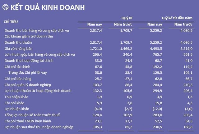 Lợi nhuận sau thuế quý III/2022 toàn Công ty đạt 105 tỷ đồng, tăng 20 tỷ đồng so với cùng kỳ quý III/2021 tương ứng với mức tăng 23%. Lũy kế 9 tháng lợi nhuận sau thuế toàn Công ty đạt 230 tỷ đồng, tăng 62 tỷ đồng so với cùng kỳ tương ứng với mức tăng 37%.