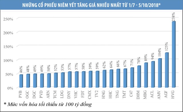 Trong khối thủy sản, từ mức giá 2.600 đồng/cổ phiếu đầu quý III/2018, cổ phiếu HVG của Công ty cổ phần Thủy sản Hùng Vương đã có chuỗi tăng giá thần tốc và đóng cửa phiên 5/10 tại 8.600 đồng/cổ phiếu, tương đương tăng 238%.