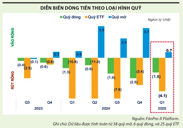 Dù mức vào ròng khiêm tốn trong quý I, nhưng quỹ mở là nhóm duy nhất duy trì hút ròng kể từ quý IV/2023 tới nay, trong bối cảnh các nhóm quỹ khác bị rút ròng mạnh. Cụ thể, nhóm quỹ đóng và quỹ ETF bị rút ròng tổng cộng gần 6.000 tỷ đồng, chủ yếu ở nhóm quỹ ETF (bị rút ròng 4.100 tỷ đồng). Áp lực rút ròng tập trung ở Quỹ Fubon FTSE Vietnam ETF, dù quỹ này có hiệu suất đầu tư dương trong quý đầu năm (tăng trưởng 6,6%) và lũy kế từ đầu năm đến ngày 11/4/2025 đạt 1,4%.