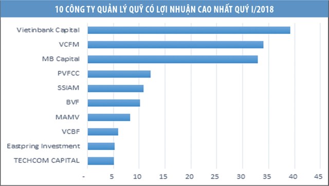 Quý I/2018, các công ty quản lý quỹ tiếp tục đạt kết quả hoạt động khả quan. Đa phần các công ty thuộc Top đầu đều có kết quả cao hơn cùng kỳ năm trước. Ba công ty có mức lợi nhuận cao nhất lần lượt gồm có VietinCap (39 tỷ đồng), VinaCapital (34 tỷ đồng) và MBCap (33 tỷ đồng).