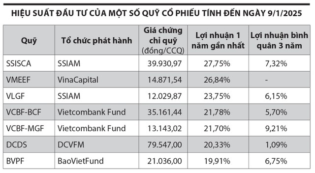 Theo thống kê, có 19 quỹ cổ phiếu đạt hiệu suất cao hơn VN-Index là VMEEF, SSISCA, VLGF, VCBF-BCF, VCBF-MGF, BVPF, VEOF, DCDS, MAGEF, VESAF, MBVF, UVEEF, MAFEQI, BVFED, TBLF, PHVSF, DCAF, VNDAF, DCDE. Trong đó, có 13 quỹ đạt hiệu suất cao hơn 20%, nổi bật nhất là VMEEF và SSISCA khi mang lợi nhuận trên 30%.