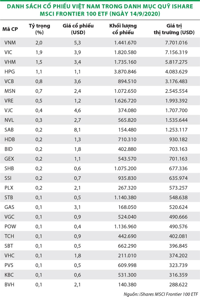 Theo đó, các cổ phiếu Việt Nam hiện có trong danh mục của MSCI Frontier Markets Index và MSCI Frontier Markets 100 Index sẽ được các quỹ ngoại theo dõi các chỉ số thị trường cận biên mua ròng sau khi Kuwait dự kiến được nâng hạng lên thị trường mới nổi vào tháng 11/2020, đặc biệt là các cổ phiếu vốn hóa lớn đang chiếm tỷ trọng cao như VNM, VIC, VHM, MSN, VRE, HPG, VCB.