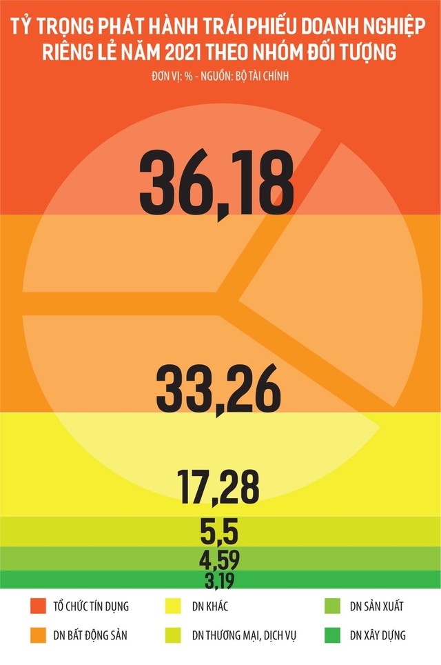 Số liệu thống kê của Bộ Tài chính cho thấy, trong năm 2021, các tổ chức tín dụng phát hành khối lượng trái phiếu riêng lẻ lớn nhất, chiếm 36,18% tổng khối lượng phát hành; doanh nghiệp bất động sản chiếm 33,26% tổng khối lượng phát hành; các doanh nghiệp thương mại dịch vụ, sản xuất và xây dựng chiếm lần lượt 5,5%, 4,59% và 3,19% tổng khối lượng phát hành.