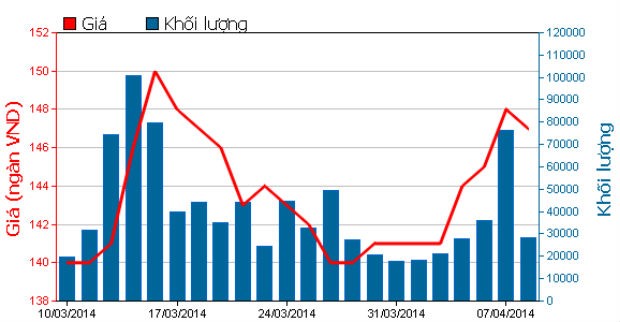 Trong 1 tháng gần đây, giá cổ phiếu VNM đã có khá nhiều biến động. Có thời điểm, VNM đã tăng từ 139.000 đồng lên 150.000 đồng, sau đó lại giảm về 140.000 đồng, nhưng chỉ trong 3 phiên trở lại đây, cổ phiếu VNM lại bật tăng mạnh trở lại lên 149.000 đồng. Đóng cửa phiên 8/4, VNM đã giảm 1.000 đồng xuống còn 148.000 đồng.