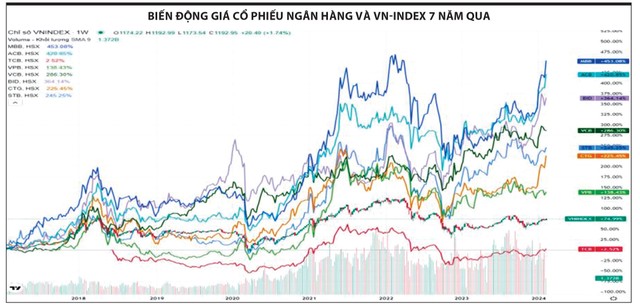 Ví dụ, nếu chúng ta mang 100 triệu đồng đầu tư vào cổ phiếu Ngân hàng TMCP Quân đội (mã chứng khoán MBB) từ tháng 1/2017 và nắm giữ đến nay thì cho dù thị trường có tăng/giảm với hai đợt điều chỉnh lớn và nhiều nhịp điều chỉnh nhỏ, khi mang bán, chúng ta sẽ thu về hơn 475 triệu đồng, tức là lợi nhuận gấp 4,7 lần so với số tiền bỏ ra ban đầu, hiệu quả cao hơn gấp khoảng 8,3 lần so với gửi tiết kiệm. Cũng với 100 triệu đồng, nếu mang gửi tiết kiệm kỳ hạn 12 tháng với mức lãi suất trung bình ở mức khoảng 5,5%/năm thì đến nay, tính theo công thức lãi suất kép, chúng ta chỉ thu về được khoảng 145 triệu đồng cả gốc và lãi.
