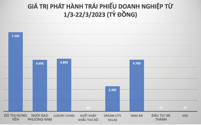 Theo tìm hiểu của Báo Đầu tư Chứng khoán, các thương vụ phát hành trái phiếu có giá trị lớn trong nửa đầu tháng 3/2023 đều tới từ các doanh nghiệp hoạt động trong lĩnh vực bất động sản như Công ty TNHH Kinh doanh nội thất Luxury Living (4.800 tỷ đồng), Công ty cổ phần Đầu tư và kinh doanh Nam An (4.700 tỷ đồng), Công ty cổ phần Đầu tư kinh doanh và phát triển đô thị Ngôi Sao Phương Nam (4.695 tỷ đồng), Công ty TNHH Kinh doanh bất động sản Dream City Villas (2.300 tỷ đồng)...