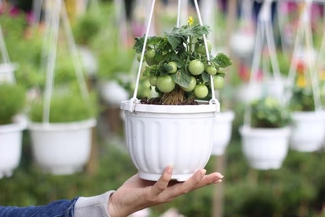 Cũng khá đắt hàng như củ cải đỏ, cà chua bi được khách đặt mua từ rất sớm. "Toàn bộ 1.500 chậu cà chua bi Đà Lạt được thương lái thu mua với giá 70.000 đồng. Điểm đặc biệt của chậu kiểng cà chua là cao chưa đến 25 cm nhưng trái xum xuê 3 màu", ông Tài nói.