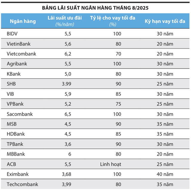 Hiện nay, nhiều ngân hàng thương mại triển khai các gói vay mua nhà với lãi suất ưu đãi chỉ từ 6-7%/năm cố định trong 12 tháng đầu, thấp nhất trong vòng 3 năm qua. Một số ngân hàng còn tung ra gói vay ưu đãi kéo dài tới 3-5 năm, kèm theo chính sách ân hạn nợ gốc hoặc lãi suất trong thời gian đầu.