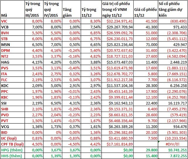 Với số liệu thực tế ngày 11/12/2015, tổng giá trị tài sản ròng của quỹ VNM đạt 388,3 triệu USD, tỷ trọng danh mục cổ phiếu Việt Nam đạt 80,33% như vậy VNM sẽ mua thêm khoảng 6,47 triệu USD các cổ phiếu Việt Nam. Với việc thêm mới hai cổ phiếu HPG và HHS khoảng 5,06% danh mục và bán ra cổ phiếu IJC (chiếm 0,88% danh mục), như vậy VNM sẽ phải bán bớt khoảng 9,75 triệu USD (219 tỷ đồng) tại các cổ phiếu Việt Nam khác để đảm bảo tỷ trọng cổ phiếu Việt Nam trong rổ đạt 82%.