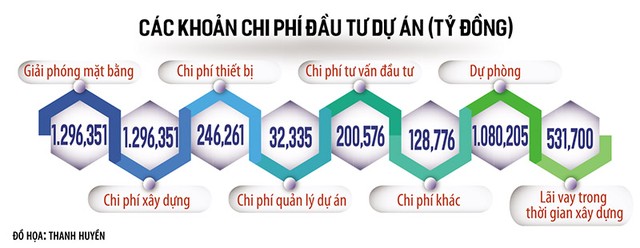 Với quy mô đầu tư như trên, tổng mức đầu tư Dự án là 9.035,4 tỷ đồng, trong đó 2 khoản kinh phí lớn nhất là giải phóng mặt bằng 1.269 tỷ đồng và chi phí xây dựng 5.537,2 tỷ đồng. Đáng chú ý, chi phí lãi vay trong thời gian xây dựng được xác định là 531,7 tỷ đồng.