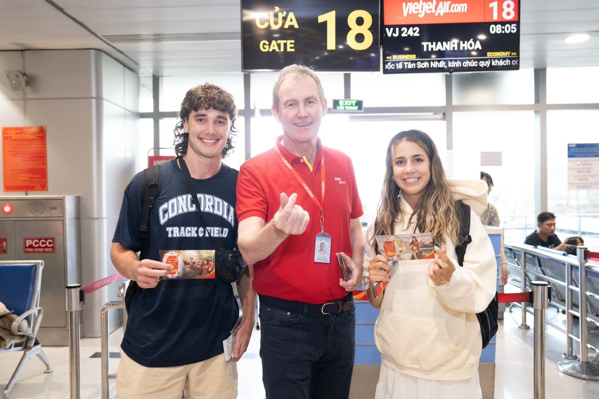 | Các khách hàng và phi hành đoàn Vietjet nhận những món quà lì xì may mắn từ Phó Tổng giám đốc vận hành Vietjet Micheal Hickey và Phó Tổng giám đốc Hồ Ngọc Yến Phương. |