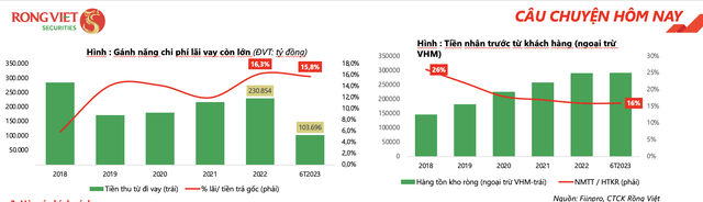 Theo Rồng Việt, cùng với tình trạng hạn chế trong phê duyệt dự án, gánh nặng tài chính về chi phí lãi vay và huy động vốn của các doanh nghiệp cũng trong tình trạng khó khăn (hệ số Người mua trả trước/ Hàng tồn kho giảm mạnh). Mặc dù, cấu trúc tài chính của các doanh nghiệp chưa ở mức báo động, nhưng vấn đề thanh khoản vẫn đang “nóng” khi trong 7 tháng năm 2023, số lượng doanh nghiệp bất động sản giải thể là 756 doanh nghiệp (+17% so với cùng kỳ, số liệu từ Tổng cục Thống kê).