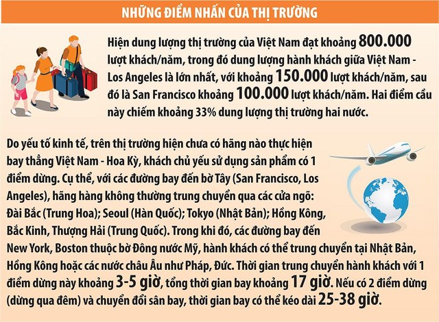 Đó là chưa kể, các loại tàu bay lớn nhất mà Vietnam Airlines và Bamboo Airways đang khai thác là Airbus350-900, Boeing 787-9 và Boeing 787-10 đều có thể khai thác bay thẳng đến Hoa Kỳ. Tuy nhiên, nếu bay thẳng, không điểm dừng kỹ thuật thì các loại tàu bay này đều phải giảm tải.