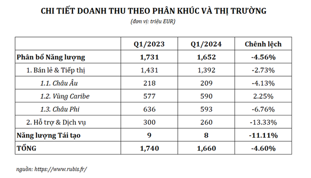 Liên quan đến hoạt động sản xuất năng lượng tái tạo, công suất hoạt động trên các tài sản của Photosol tăng 5% so với quý kinh doanh kết thúc vào tháng 12/2023, lên tới 936 MWp. Liên quan đến thỏa thuận mua bán điện năng (PPA), Rubis đã ký được các thỏa thuận hợp tác lớn với Data4 và một khách hàng tổ chức lớn khác, với tổng công suất lên tới 105MWp.