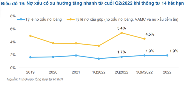 Theo bà Trần Kiều Oanh, Trưởng phòng Khối Phân tích Định chế Tài chính thuộc FiinGroup, chất lượng tín dụng đang đi xuống ở nhiều ngành, nợ xấu dần lộ diện kể từ khi Thông tư 14/2021/TT-NHNN của Ngân hàng Nhà nước hết hiệu lực từ cuối tháng 6/2022. Cuối năm 2022, tỷ lệ nợ xấu nội bảng đã tăng lên 1,92%, tỷ lệ nợ xấu gộp khoảng 4,5%.