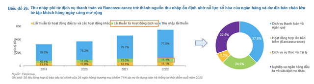 FiinGroup ước tính, trong 63,1 nghìn tỷ lãi thuần từ hoạt động dịch vụ đóng góp bởi 26 ngân hàng thương mại chiếm 71% dư nợ tín dụng toàn hệ thống, gần 38% đến từ dịch vụ thanh toán và ký quỹ, 24,5% đến từ hoạt động hợp tác bảo hiểm Bancassurance và 30,5% từ nghiệp vụ ngân hàng đầu tư và các dịch vụ khác.