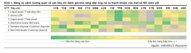 VNDirect cho rằng, nếu như sở hữu các đặc điểm này, ngân hàng sẽ có thể đáp ứng được nhu cầu tiền mặt đột biến của khách hàng do vốn huy động đã được tối ưu hóa và không chỉ để phục vụ chủ yếu cho mục đích vay trung và dài hạn. Mặt khác, nếu như không phụ thuộc nhiều vào vốn huy động có kỳ hạn từ khách hàng cá nhân, ngân hàng đó sẽ chịu ảnh hưởng ít hơn so sánh tương quan một số tiêu chí về khả năng đáp ứng rủi ro thanh khoản với các ngân hàng niêm yết khác.
