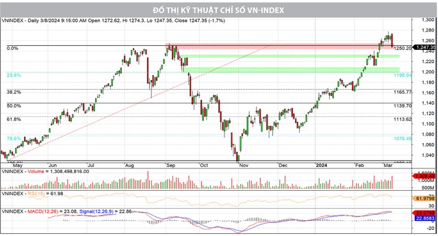 Nhìn chung, sau nhịp tăng mạnh vượt đỉnh cũ tháng 9/2023, VN-Index đã có vận động điều chỉnh trong tuần qua. Mặc dù vậy, xu hướng tăng ngắn hạn chưa được xác nhận vi phạm khi các ngưỡng hỗ trợ quan trọng được duy trì. Đồng thời, diễn biến điều chỉnh được đánh giá là hợp lý để thị trường có cơ hội kiểm định lại các vùng hỗ trợ, cũng như đón thêm lực cầu mới tham gia thị trường.