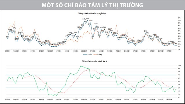 Diễn biến đi xuống của thị trường khiến nhiều vị thế ngắn hạn bị ảnh hưởng và xu thế đảo chiều giảm từ tháng 6 được xác nhận vẫn đang tiếp diễn. Thanh khoản ghi nhận cải thiện cho thấy lực cầu tăng, nhưng áp lực bán vẫn chưa giảm. Tình trạng thị trường này một phần do sự thận trọng của nhà đầu tư, thể hiện qua lực mua yếu dần, ngay cả trong những phiên chỉ số tăng điểm tốt dưới sự hỗ trợ của nhóm cổ phiếu vốn hóa lớn trong tuần trước. Dù nhiều doanh nghiệp công bố kết quả kinh doanh quý II/2024 tích cực, nhưng dòng tiền ngắn hạn chưa vội chảy vào thị trường và lực đẩy không đủ mạnh để duy trì đà tăng của chỉ số. Điều này khiến nhà đầu tư tiếp tục e ngại và thận trọng, thậm chí mất kiên nhẫn và bán cổ phiếu khi tài khoản dần bị bào mòn.
