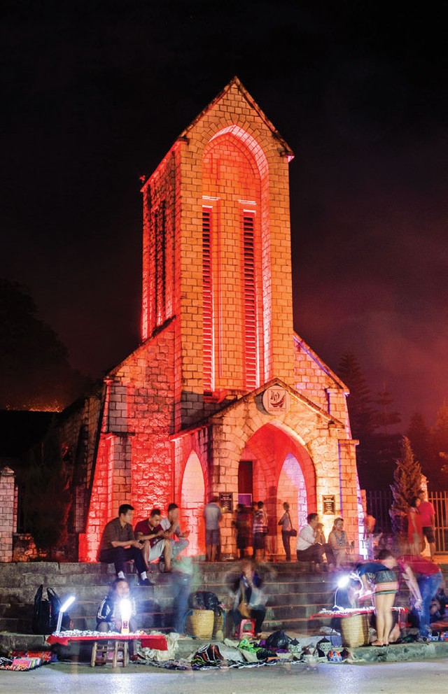 Đến Sa Pa vào dịp lễ hội cuối năm, tôi không quên ghé thăm địa danh nổi tiếng: Nhà thờ đá trên 100 năm tuổi. Đây cũng là dấu ấn kiến trúc cổ toàn vẹn nhất của người Pháp còn sót lại ở Sa Pa. Từ ngoài bước vào, tôi nhỏ bé lọt thỏm giữa không gian rộng cỡ vài ngàn mét vuông và thực sự chìm đắm trong vẻ uy nghi, bình yên của nơi này. Đối lập với bầu không khí nhộn nhịp của Giáng sinh, đâu đó vài góc trong nhà nguyện, một hai người lặng lẽ cầu nguyện với gương mặt u buồn như đang gặp nhiều gian nan và trắc trở.
