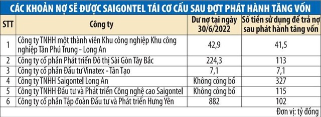 Gần 706 tỷ đồng còn lại sẽ được dùng để tái cơ cấu các khoản nợ vay thông qua trả nợ vay cho các công ty gồm: Công ty TNHH một thành viên Khu công nghiệp Tân Phú Trung - Long An (41,5 tỷ đồng), Công ty cổ phần Phát triển Đô thị Sài Gòn Tây Bắc (hơn 113 tỷ đồng), Công ty cổ phần Đầu tư Vinatex - Tân Tạo (7,1 tỷ đồng), Công ty TNHH Saigontel Long An (327 tỷ đồng), Công ty TNHH Đầu tư và Phát triển Công nghệ cao Saigontel (115 tỷ đồng), Công ty cổ phần Tập đoàn Đầu tư và Phát triển Hưng Yên (hơn 102 tỷ đồng).