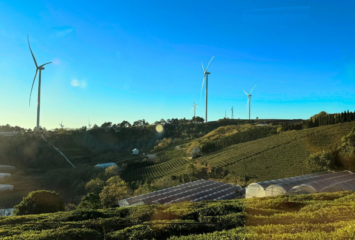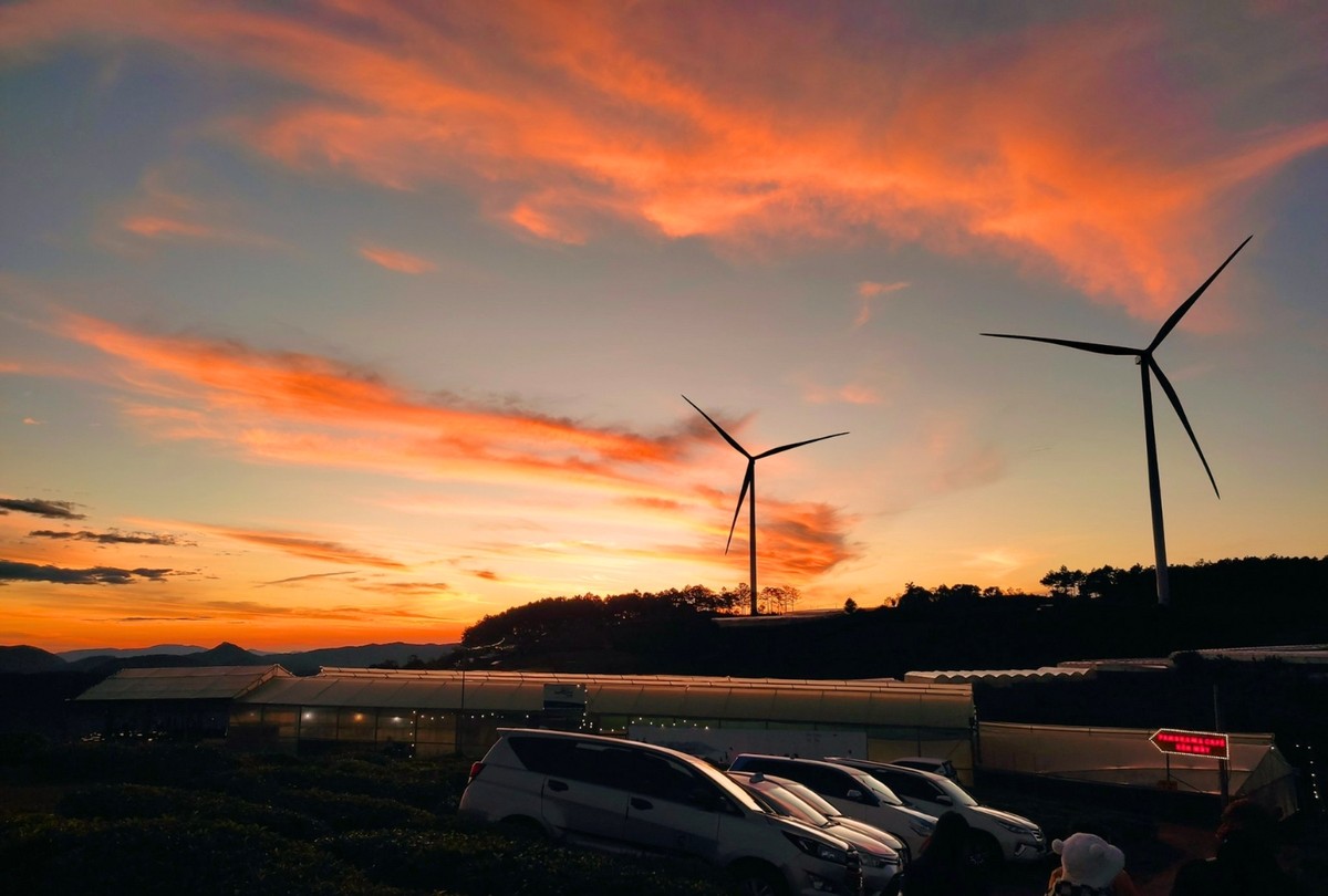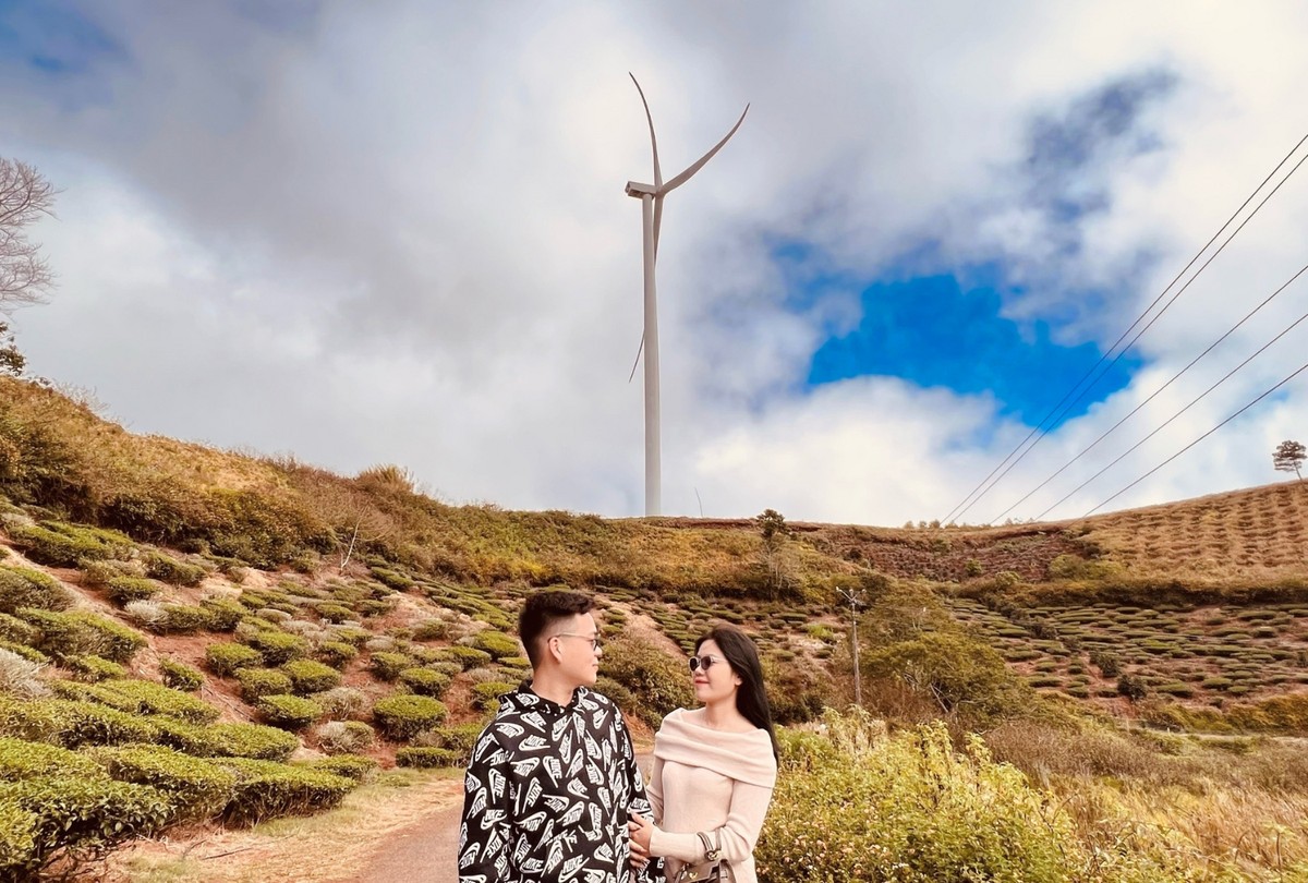 Săn mây ở đồi chè Cầu Đất bạn còn được ngắm những búp trà đọng những giọt sương sớm long lanh, được thoả sức ngắm nhìn, check-in với những cột điện gió khổng lồ.