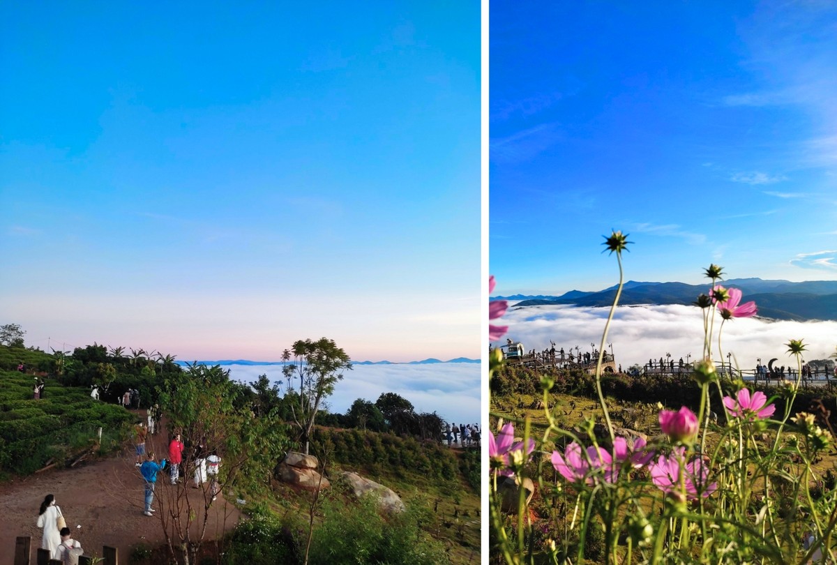 Từ đồi chè Cầu Đất, tầm nhìn của du khách sẽ được gom trọn biển mây trắng đang nô đùa trên thung lũng xanh mướt màu cỏ cây, lấp ló những tia nắng vàng nhạt giữa núi, đồi chè và cả những cánh rừng bạt ngàn, cùng hoa cỏ khoe sắc, tựa bức tranh sơn thủy hữu tình. Có lẽ, ai nấy cũng đều ra sức hít hà, tận hưởng không gian trong lành này thật lâu.